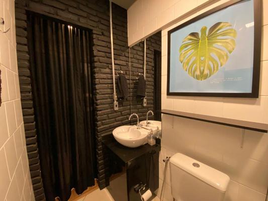 No 2º Andar temos outro banheiro, Cozinha montada e Salão com sofá e 2 estações de trabalho