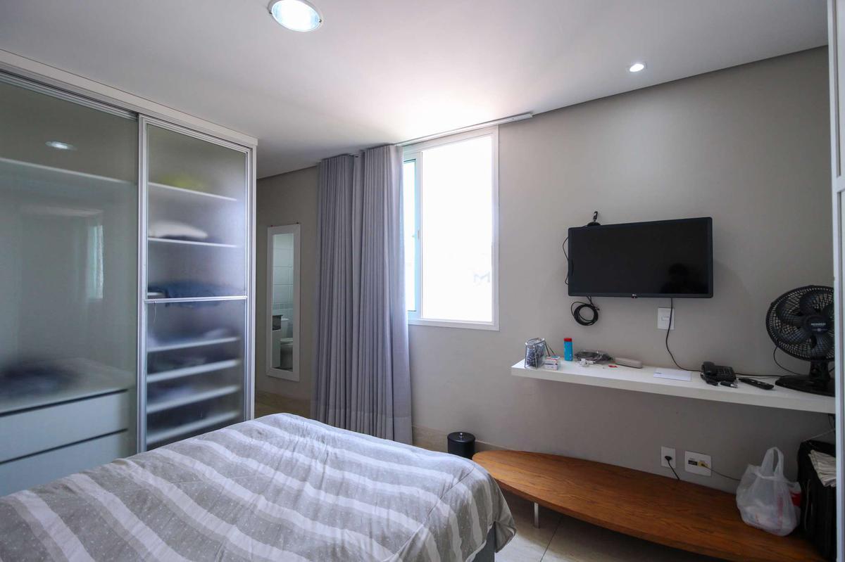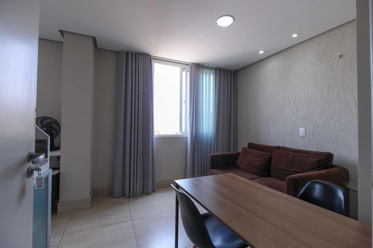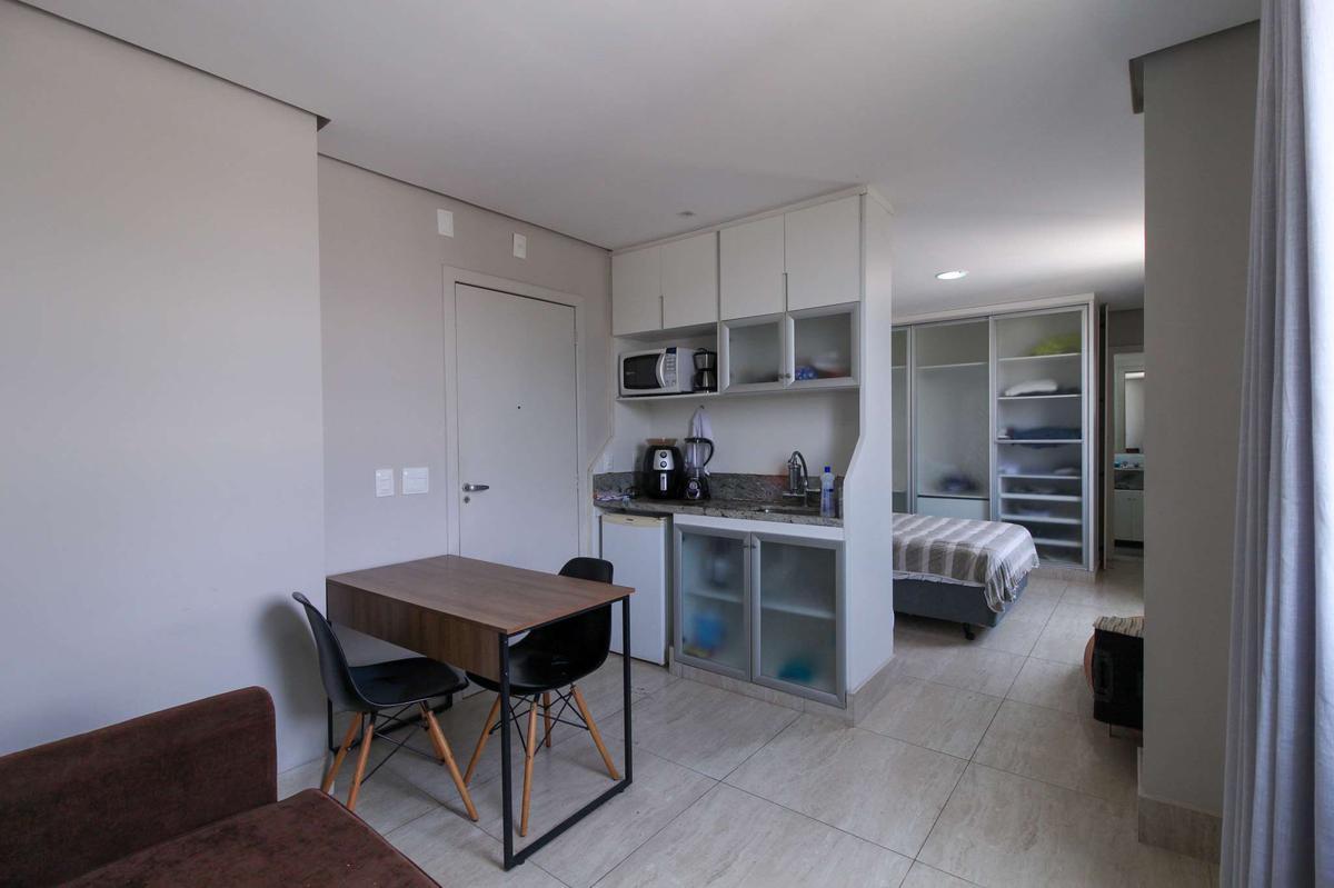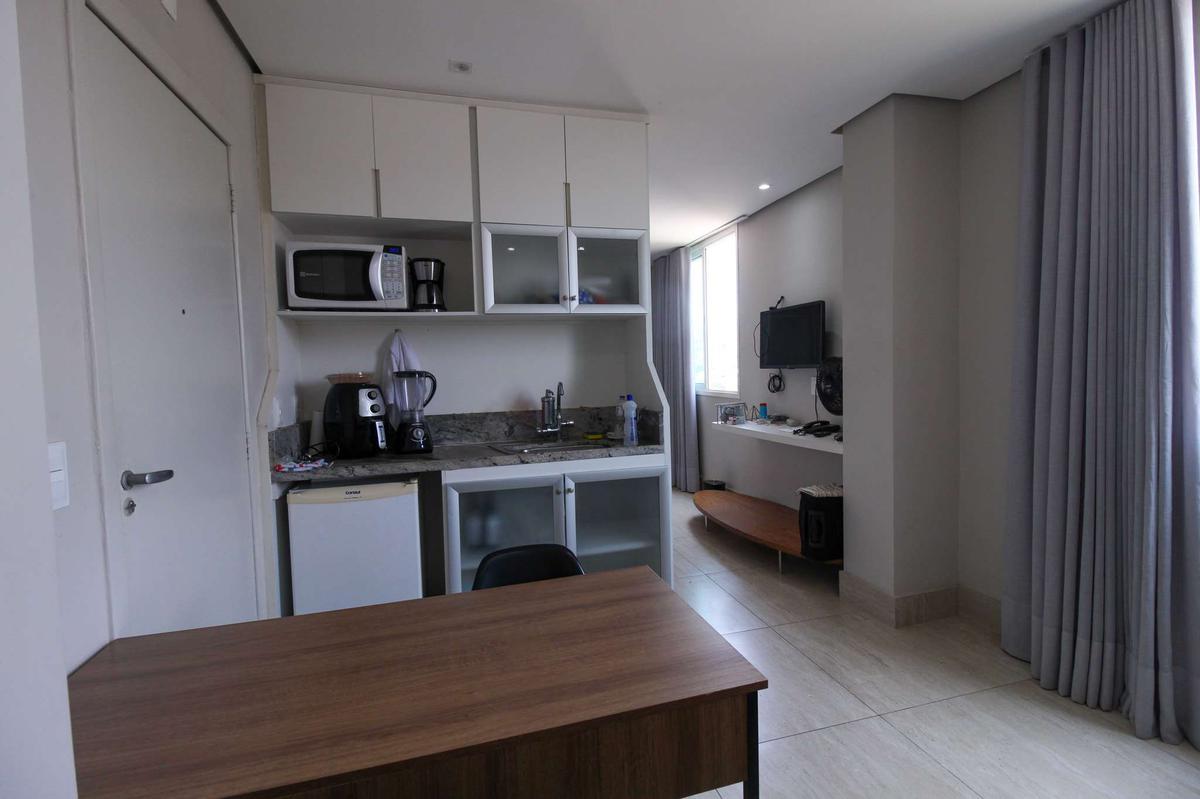 Sala e Cozinha: Sala conjugada com cozinha, equipada com sofá-cama, forno micro-ondas, refrigerador, televisão e armários, com piso em cerâmica, proporcionando um ambiente aconchegante e moderno.