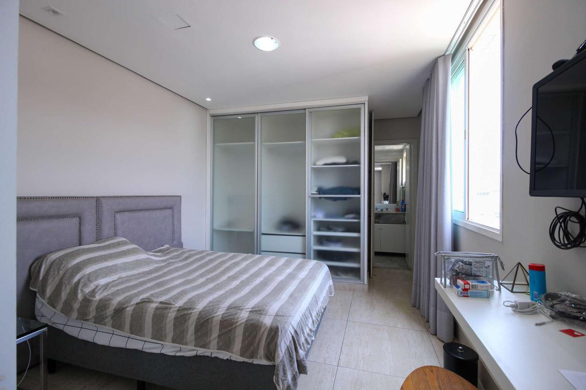 Quarto: Um quarto com cama box e armários, piso em cerâmica.