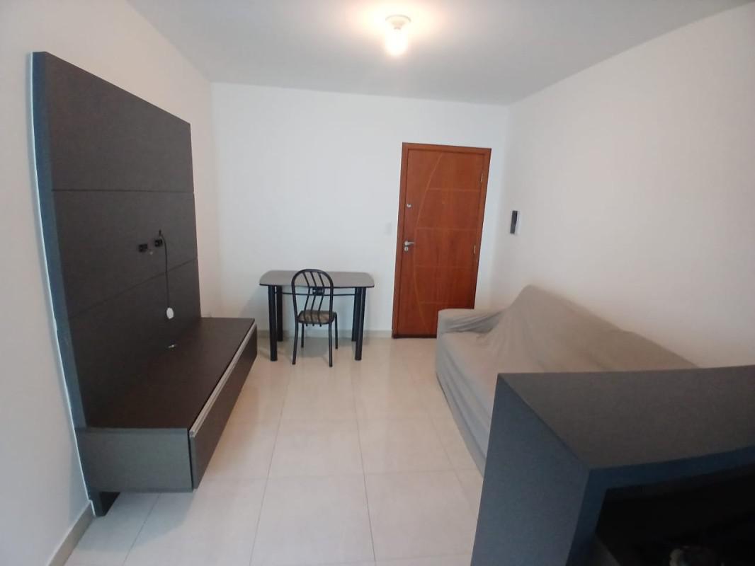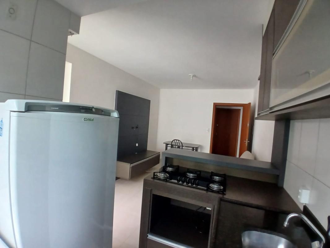 Flat de 01 quarto com armários planejados, cama box de casal com cabeceira, ar condicionado, banho social com armário, box blindex e chuveiro; cozinha estilo americana com bancada em granito, armários planejados, fogão cooktop, geladeira e maquina de lavar, sala com painel de TV e sofa; varanda com guarda corpo em Blindex; piso em porcelanato.