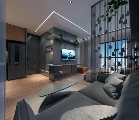 Studio com 27m² com uma suíte, sala e cozinha.
