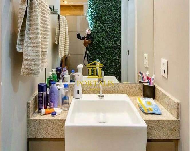 1 quarto com piso em vinílico de madeira, armários planejados, sendo a suíte com bancada em granito, pia em cuba de apoio, espelho, armários planejados e box em blindex