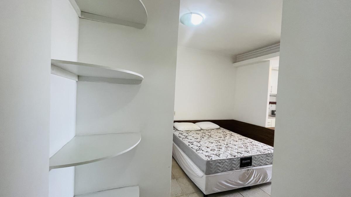 Um quarto com armário, sala conjugada, cozinha com armários, e um banheiro com box.