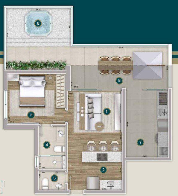 Terraço com 40m² de área interna contando com uma suíte, sala de estar, lavabo, cozinha americana, área de serviço, 38m² de área externa descoberta e uma vaga de garagem.