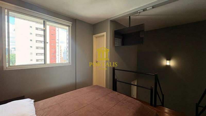 01 suíte localizada no pavimento superior, com acesso por escada, equipada com armários planejados, ar-condicionado e iluminação personalizada.