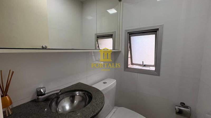 Lavabo com excelente acabamento, armário e espelho.