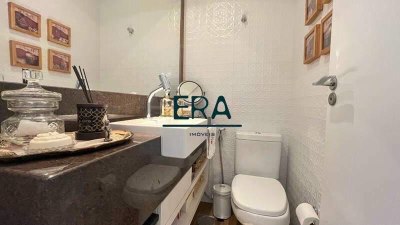 Lavabo com espelho, bancada em granito e armários planejados