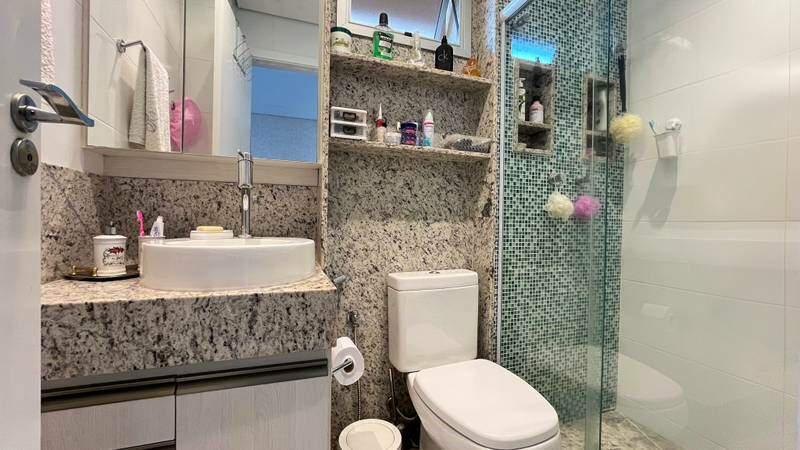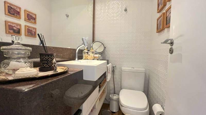 Lavabo com espelho, bancada em granito e armários planejados