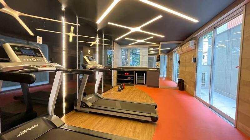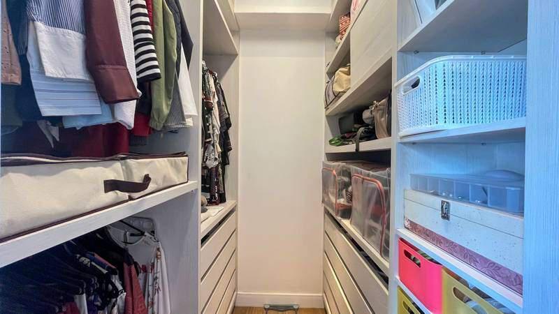 1 suíte ampla com piso em porcelanato, closet, box em blindex, espelho e armários planejados