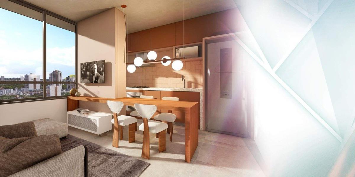 O apartamento possui 1 quarto, um banho social. Sala de jantar e estar em mesmo ambiente. Cozinha americana com área de serviço.