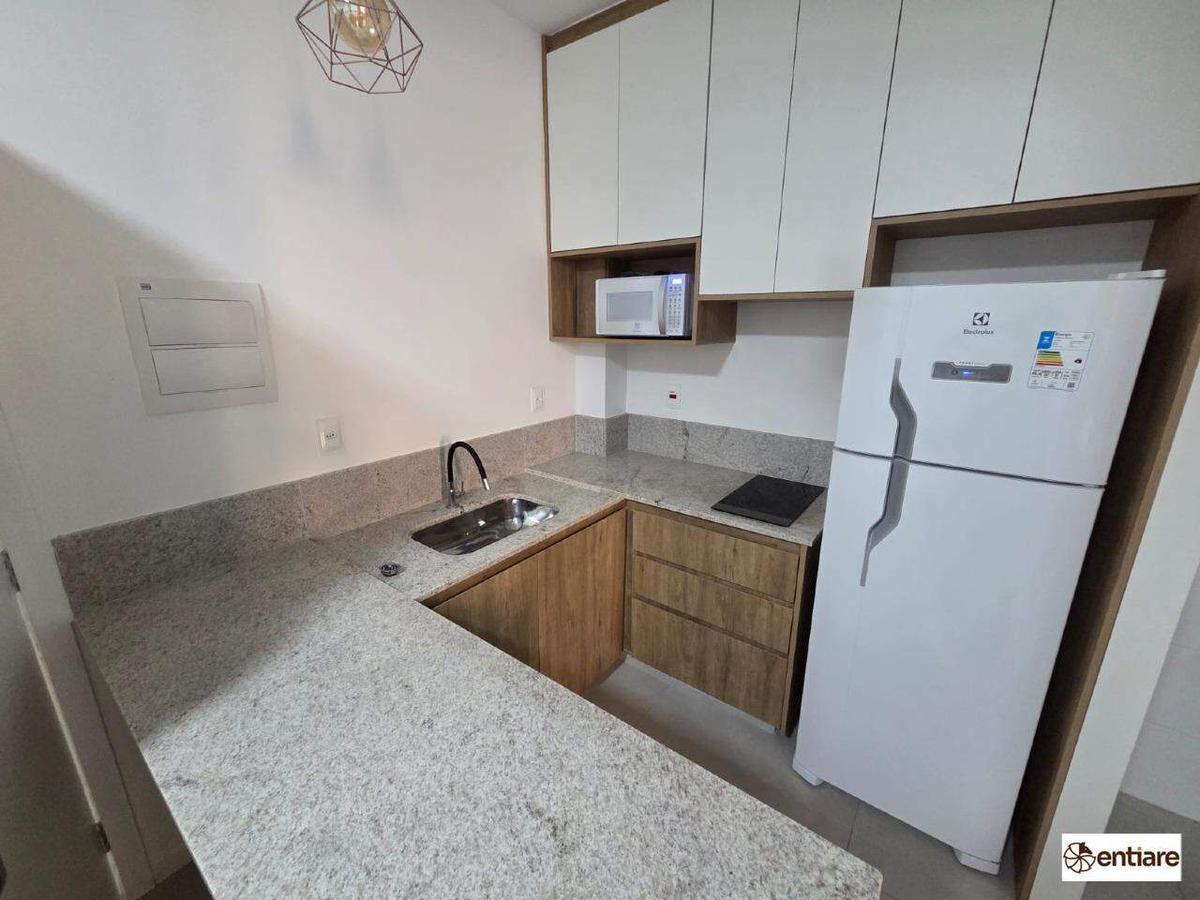 Conta com 1 quarto com armário, banheiro social e cozinha planejada com fogão por indução. Totalmente mobiliado, dispõe também de área de serviço e ar-condicionado, garantindo ainda mais comodidade.