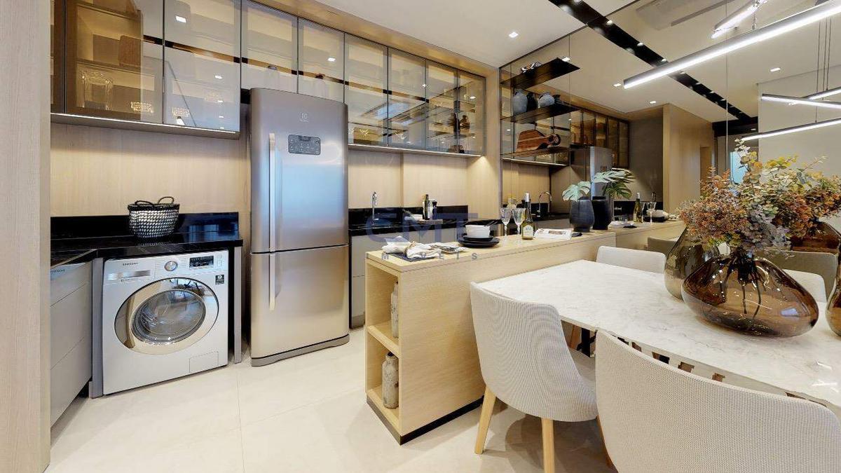 Cozinha americana com piso em porcelanato, armário planejado e bancadas em granito, integrada a área de serviço.