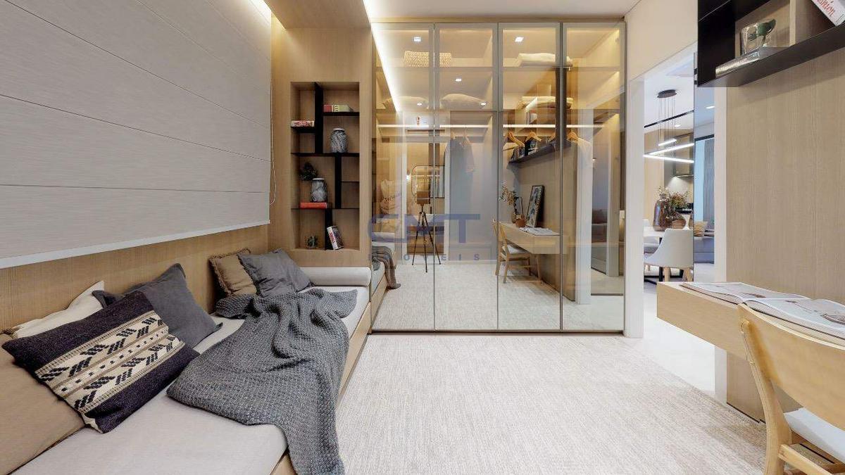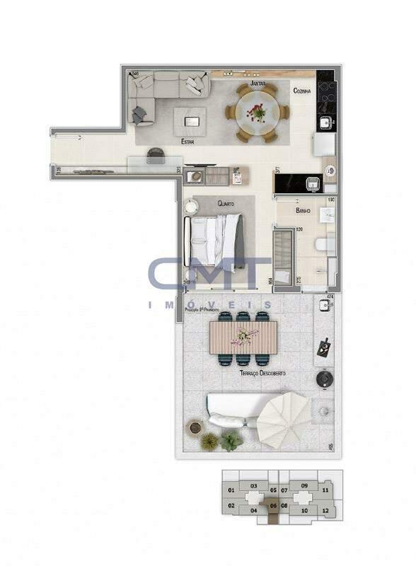 1 quarto, sendo 1 suíte com piso em porcelanato, armário planejado e portas deslizantes em esquadria de alumínio que dão acesso a ampla área privativa do apartamento.