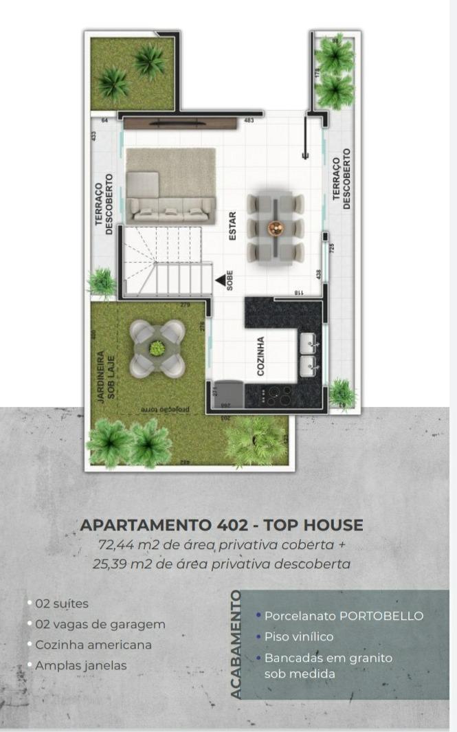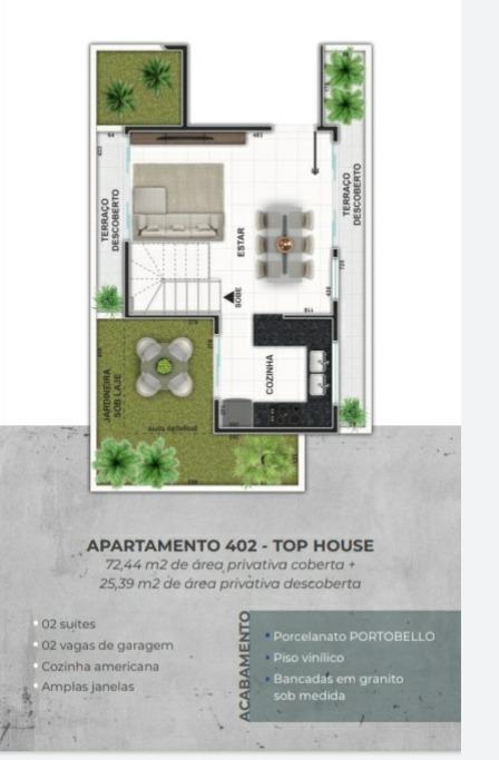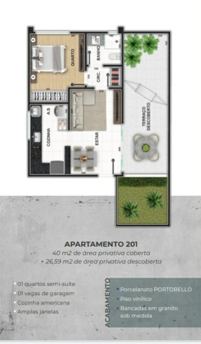 ótimo apto com 1 qto comárea privativa luxo! apto com 1 qto semi suite com área privativa 67m2 acabamento de primeira qualidade! piso do quarto, sala ,cozinha ,banho social , área de serviço com porcelanato .italiano ! pias bancadas em granito ! área privativa com 30m2 ótima para fazer churrasco! ? 01 quarto semi-suíte ? 01 vaga de garagem livre coberta e demarcada ? cozinha americana ? amplas janelas acabamento ? porcelanato portobello ? piso vinílico ? jardineiras opcionais ? bancadas em granito sob medida