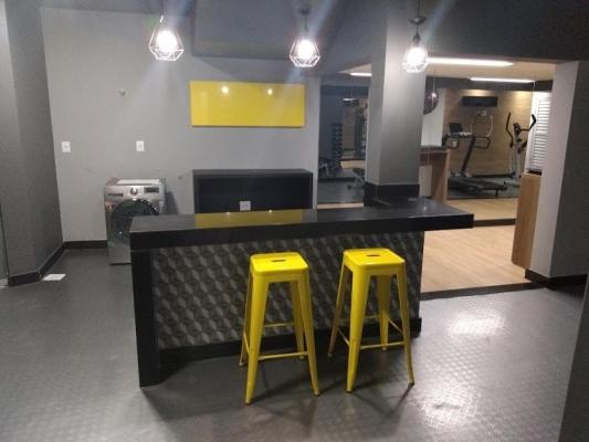 01 quarto com banho suíte, piso em laminado de madeira, armários planejados novos, cama, geladeira, fogão de indução, coifa, forno microondas e ar condicionado.