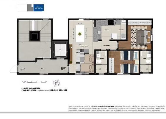 Áreas frias em porcelanato, quartos em laminado de madeira.