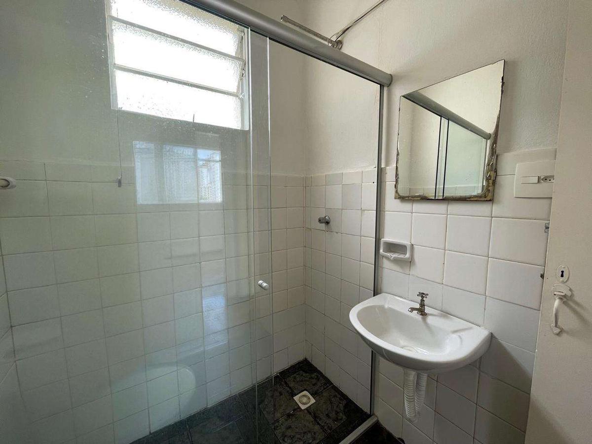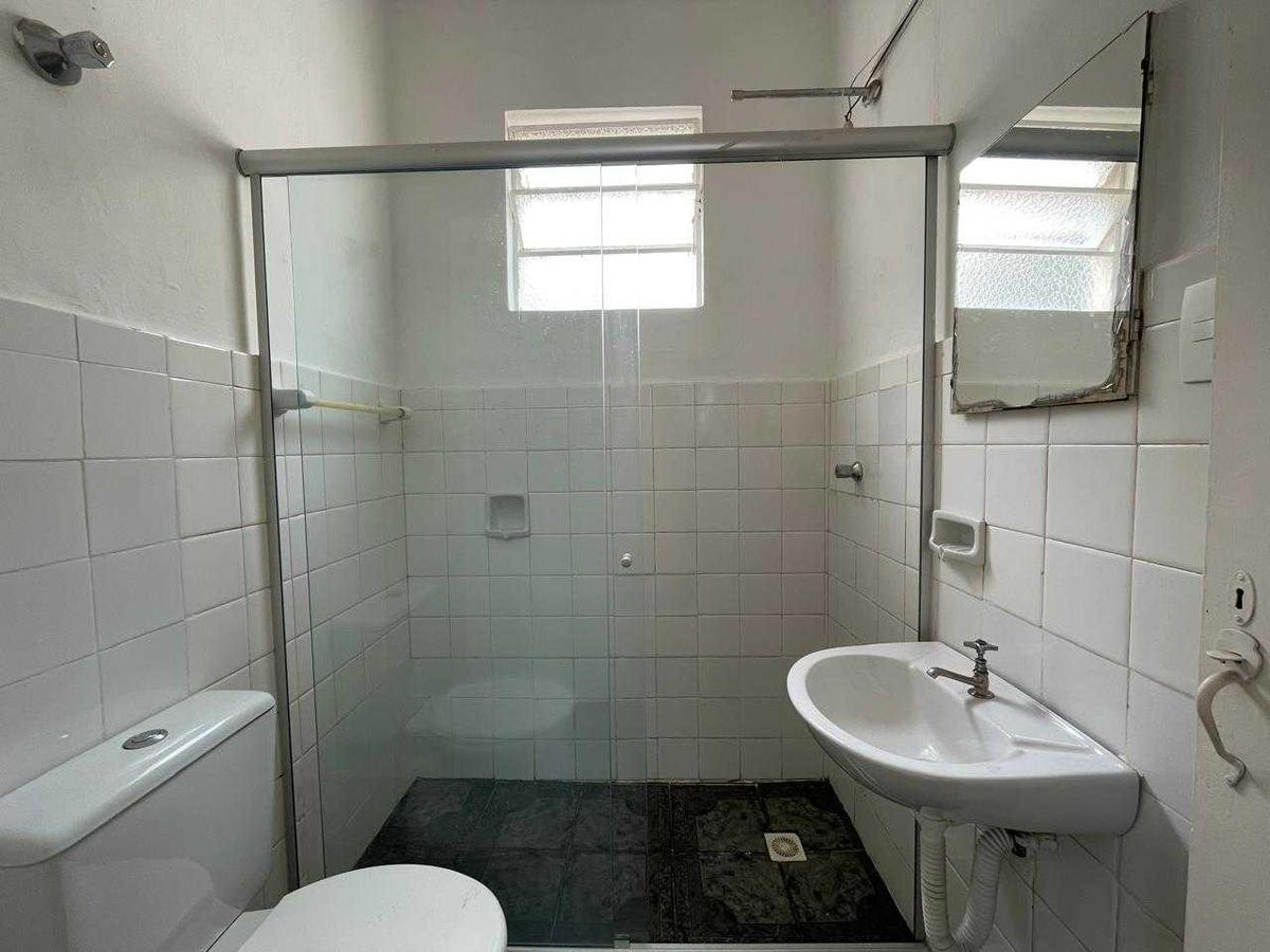 Banheiro social com box em blindex e pia com coluna de apoio