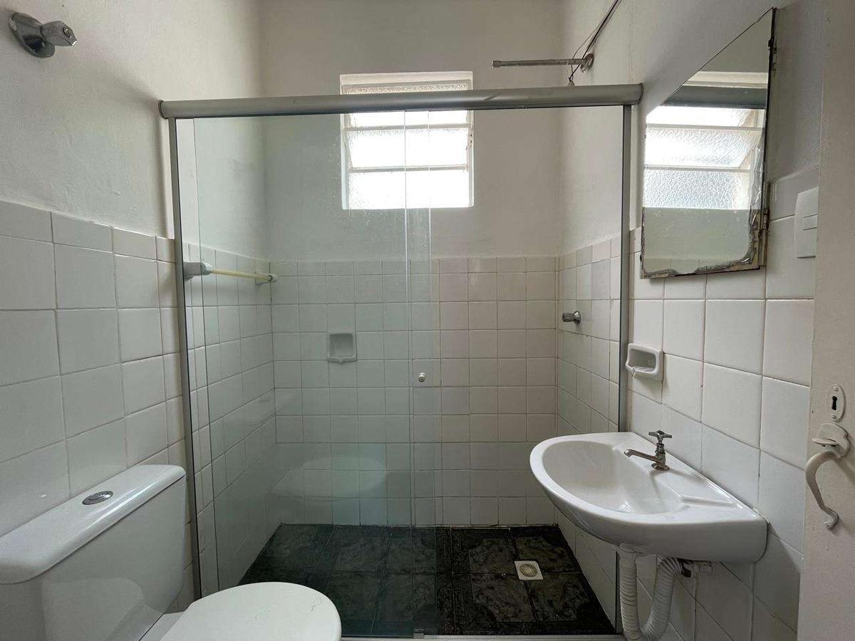 Banheiro social com box em blindex e pia com coluna de apoio