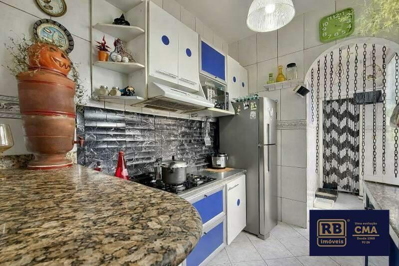 Cozinha equipada com armários planejados, cooktop, coifa e piso em cerâmica.