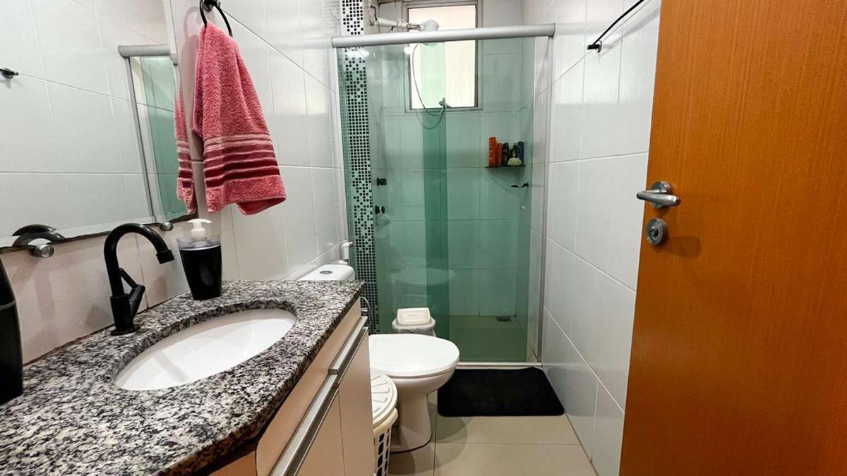 Banheiro social com acabamento em porcelanato, armário, espelho e box em Blindex.