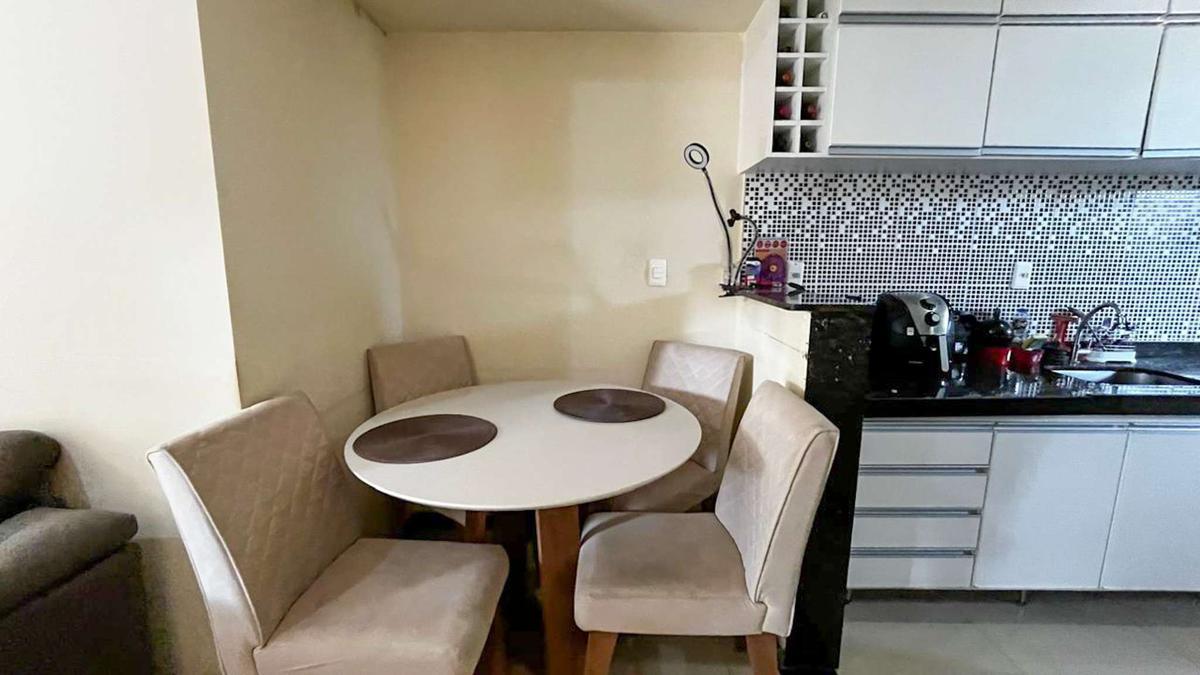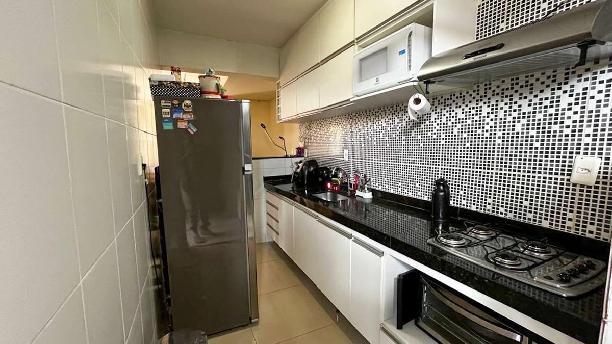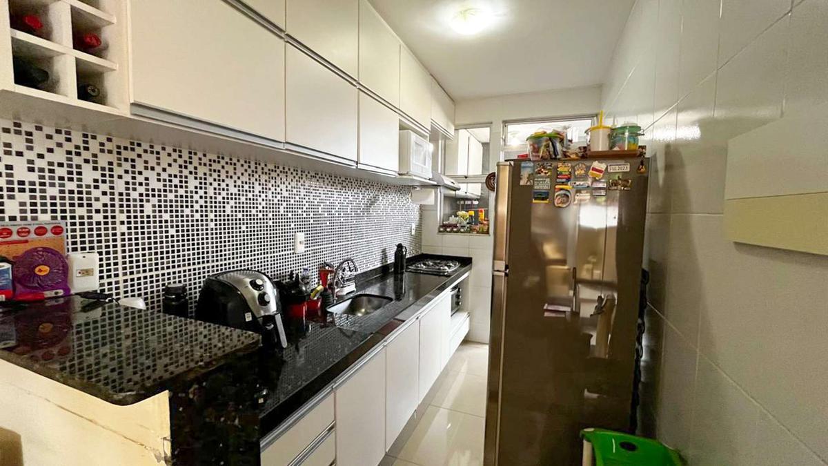 Cozinha equipada com armários planejados, bancada em granito e piso em porcelanato, oferecendo funcionalidade e durabilidade.