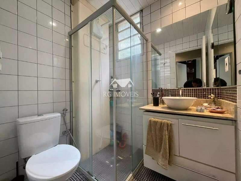 Banheiro social com bancada em granito, pia em cuba de apoio, armários planejados e box em blindex