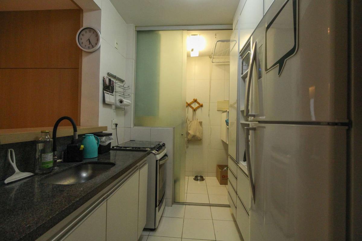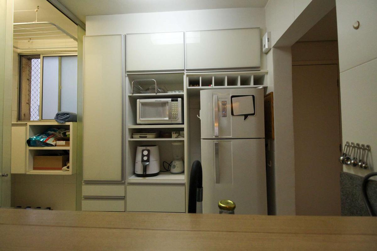 Cozinha Funcional: Cozinha estilo americana, com armários totalmente planejados, bancada em granito e piso em cerâmica.
