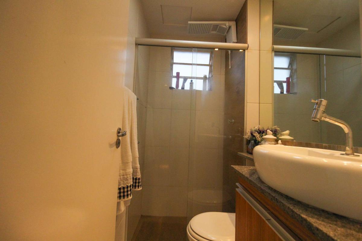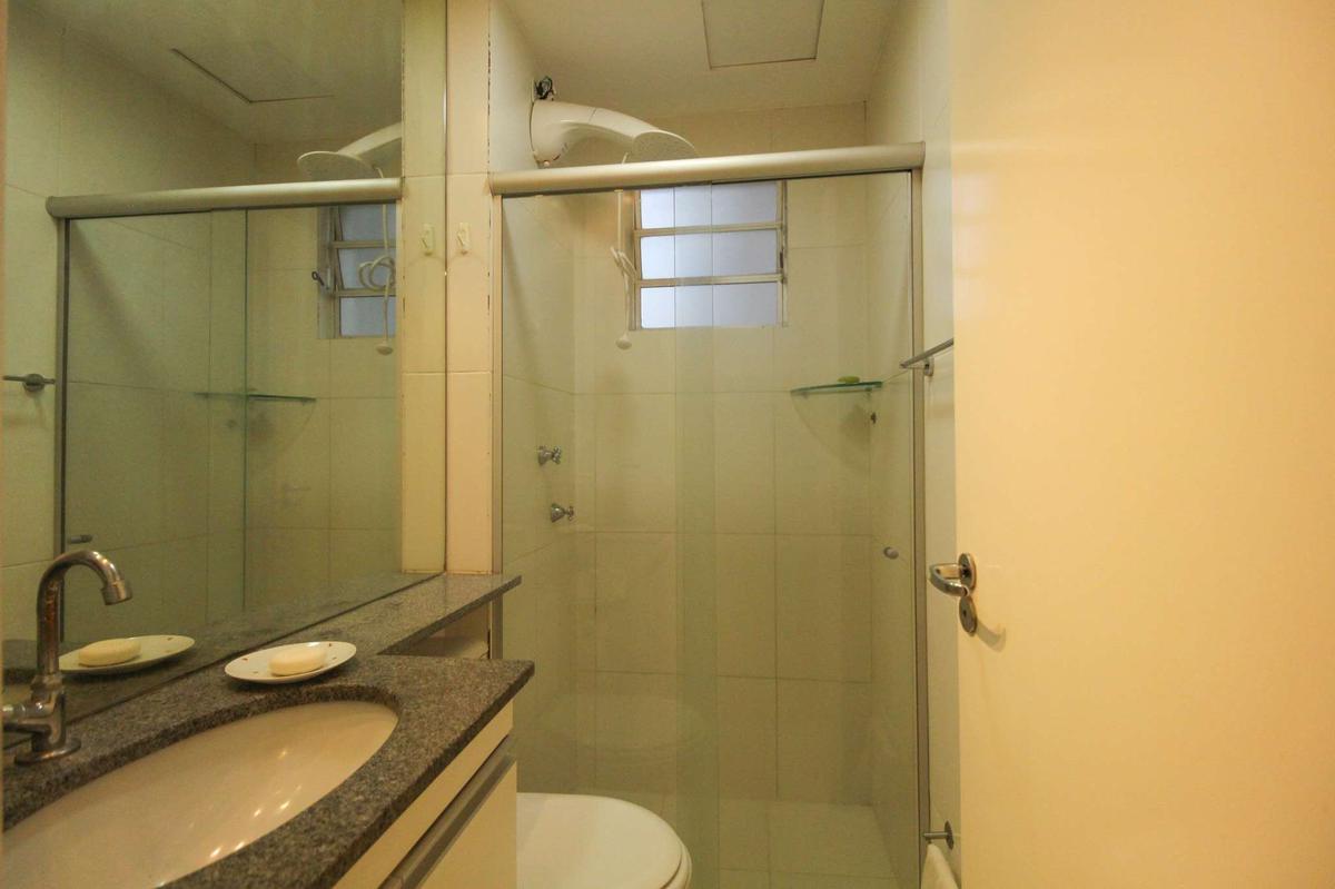 Banheiro social: Banheiro social com box em blindex, com rebaixamento em gesso, armário e com piso em cerâmica.