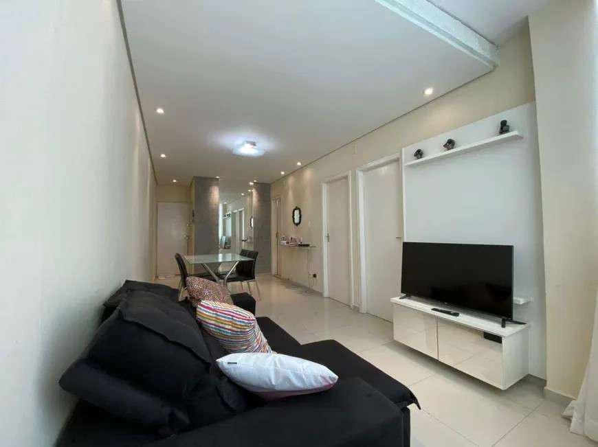 Sala para dois ambientes, com piso em porcelanato e varanda incorporada, proporcionando um ambiente confortável e bem iluminado.