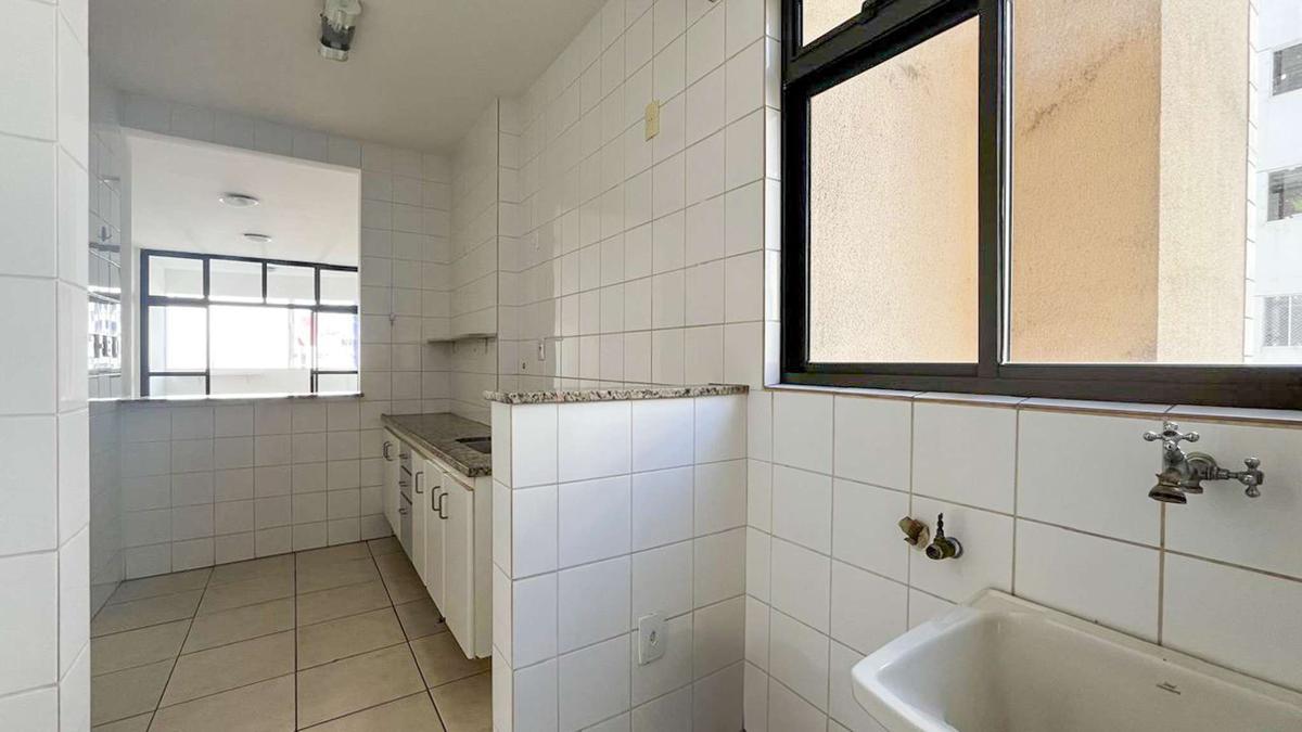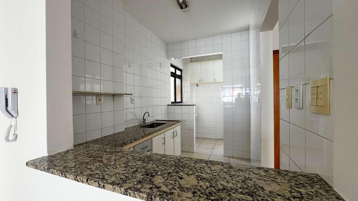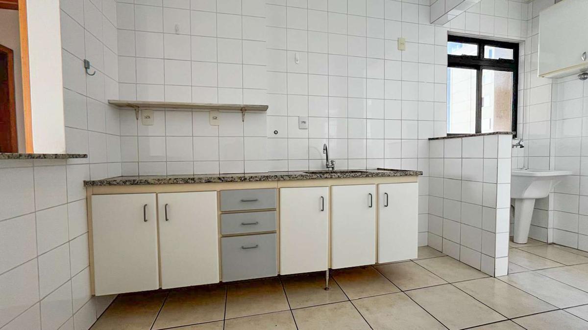 Cozinha ampla equipada com armários, piso em cerâmica, bancada em granito e área de serviço separada.