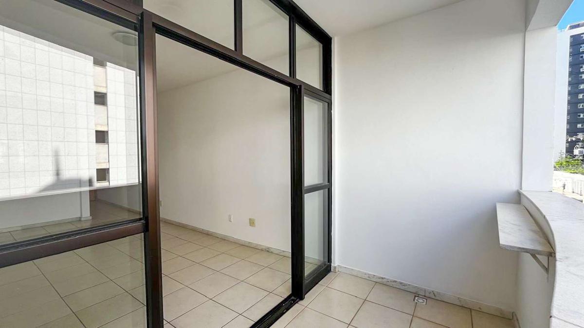 Sala projetada para dois ambientes, piso em cerâmica, criando um espaço claro e arejado, com varanda que integra o ambiente interno ao externo.