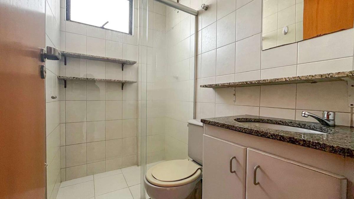 02 banheiros com detalhes sofisticados como bancadas em granito, espelho, box e armários.