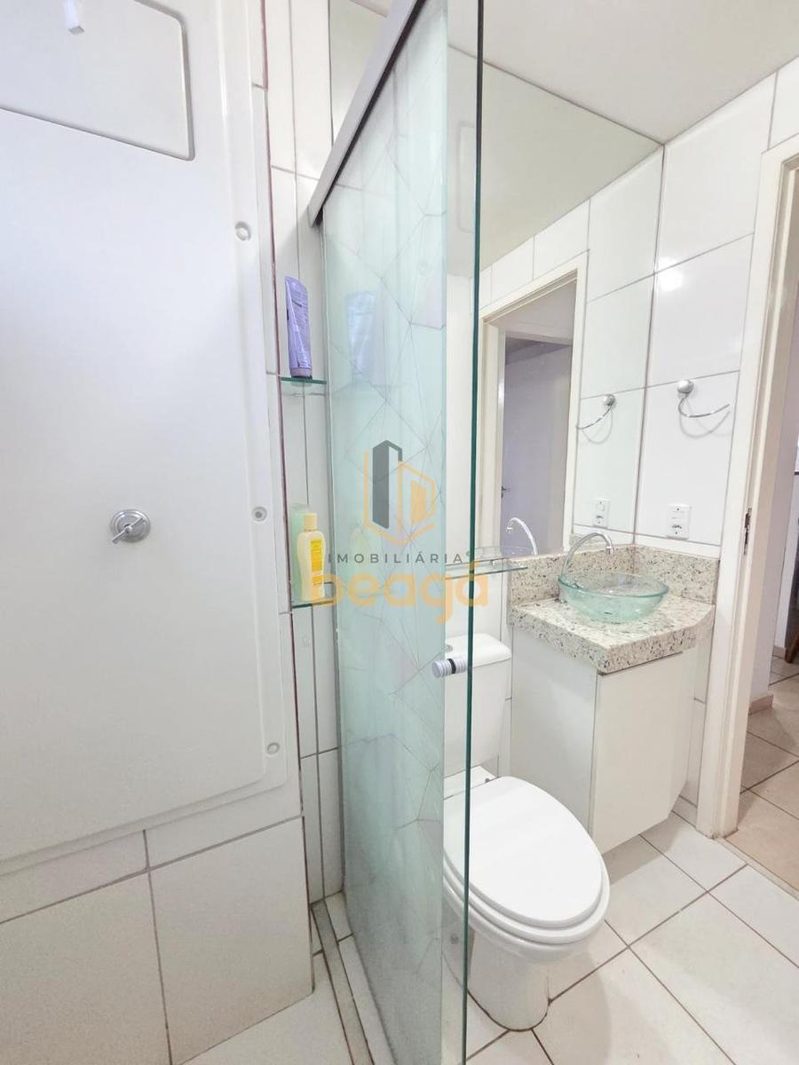 Banheiro (pia com armário e espelho grande na parede, box de vidro temperado com prateleiras de vidro, chuveiro elétrico).