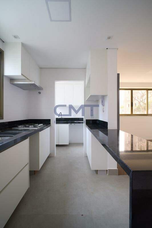 Cozinha americana ampla com armários planejados, piso em porcelanato e bancadas em granito.