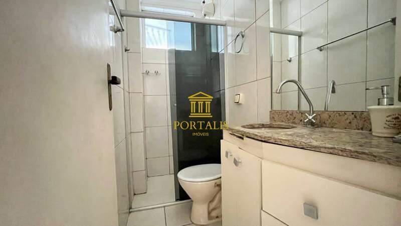 Banheiro social com bancada em granito, armários, espelho e box em blindex