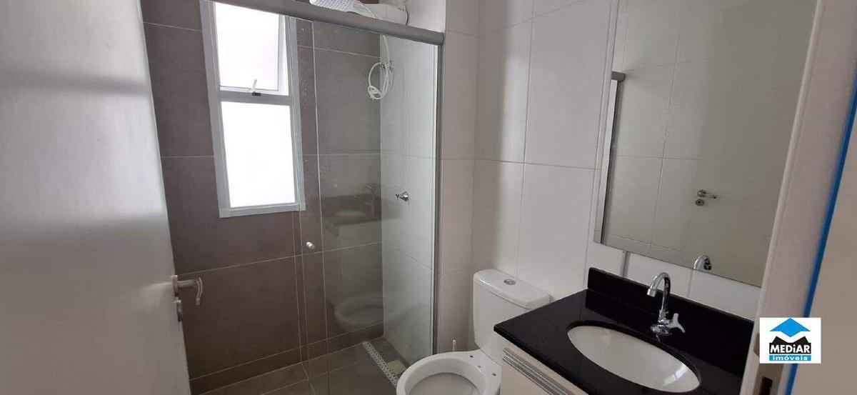 banho social com box blindex, bancada em granito, armário e espelho