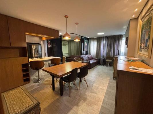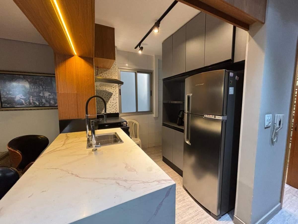 Apartamento com sala ampla, rebaixamento em gesso e iluminação planejada, cozinha americana com armários, bancada em mármore, 02 quartos sendo 01 suíte com armários, o quarto solteiro foi transfoirmado em escritório, montado com armários e painéis, banho social e suíte com excelente acabamento, bancada em marmore, box e armários.