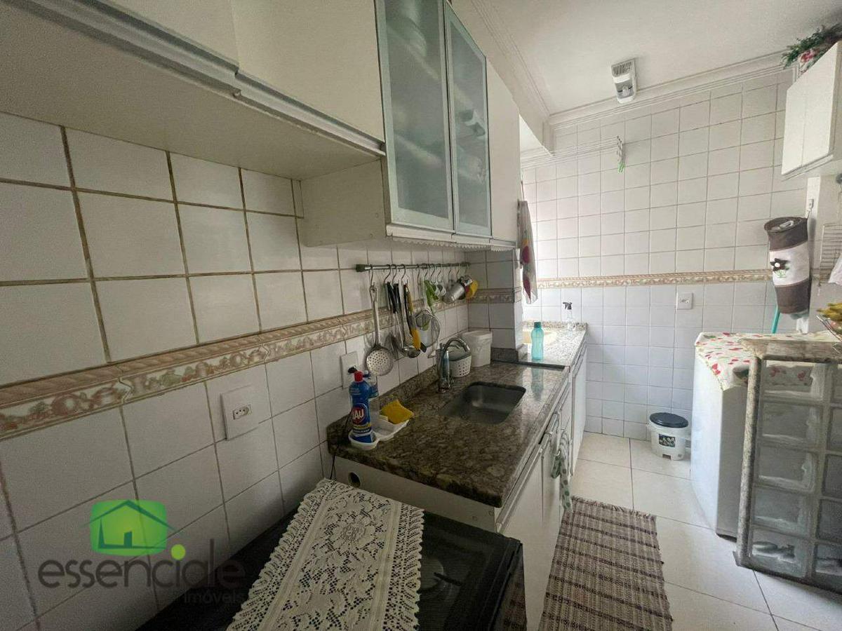 Cozinha com bancada em granito e armários planejados e área de serviço integrada.