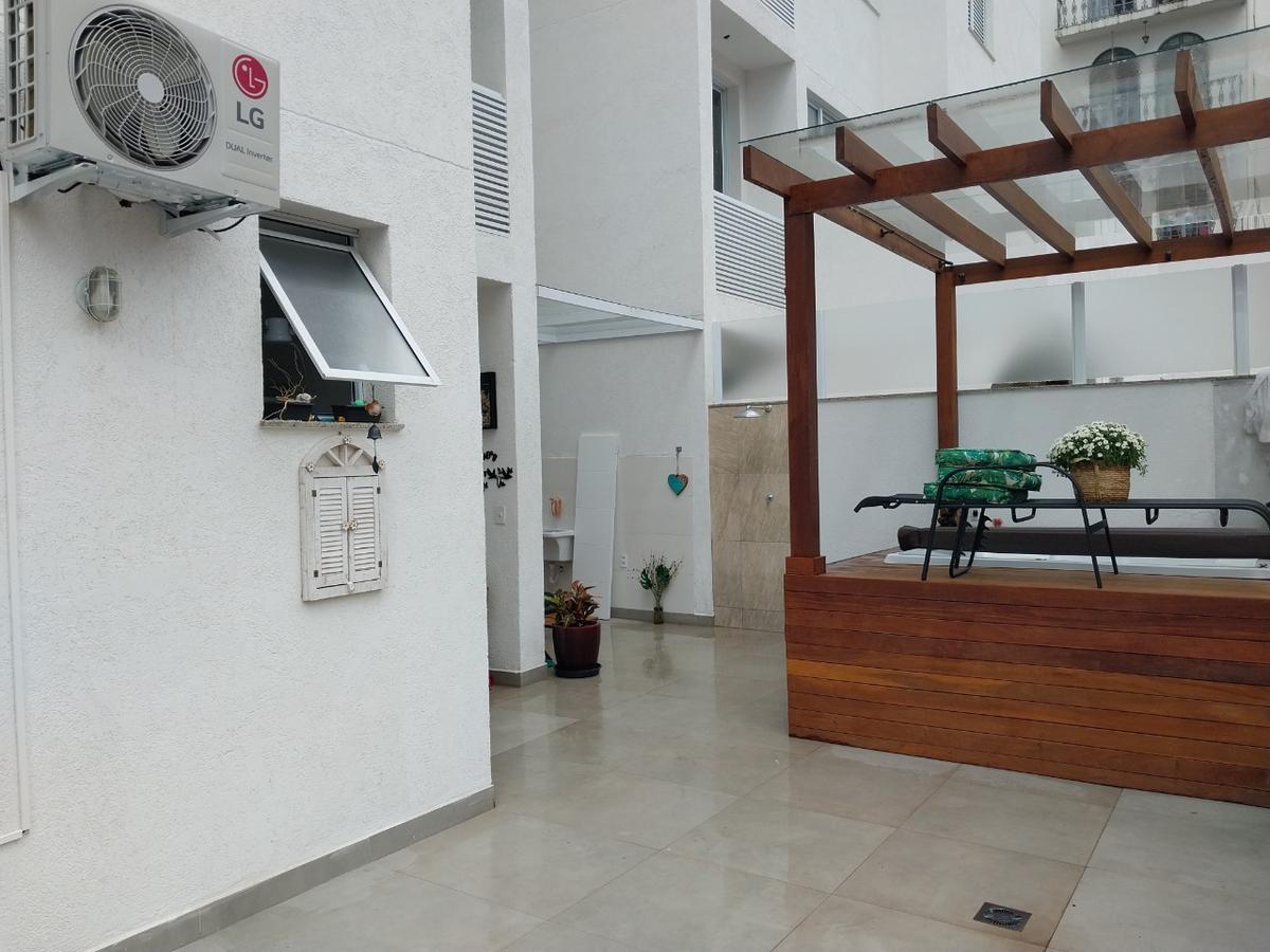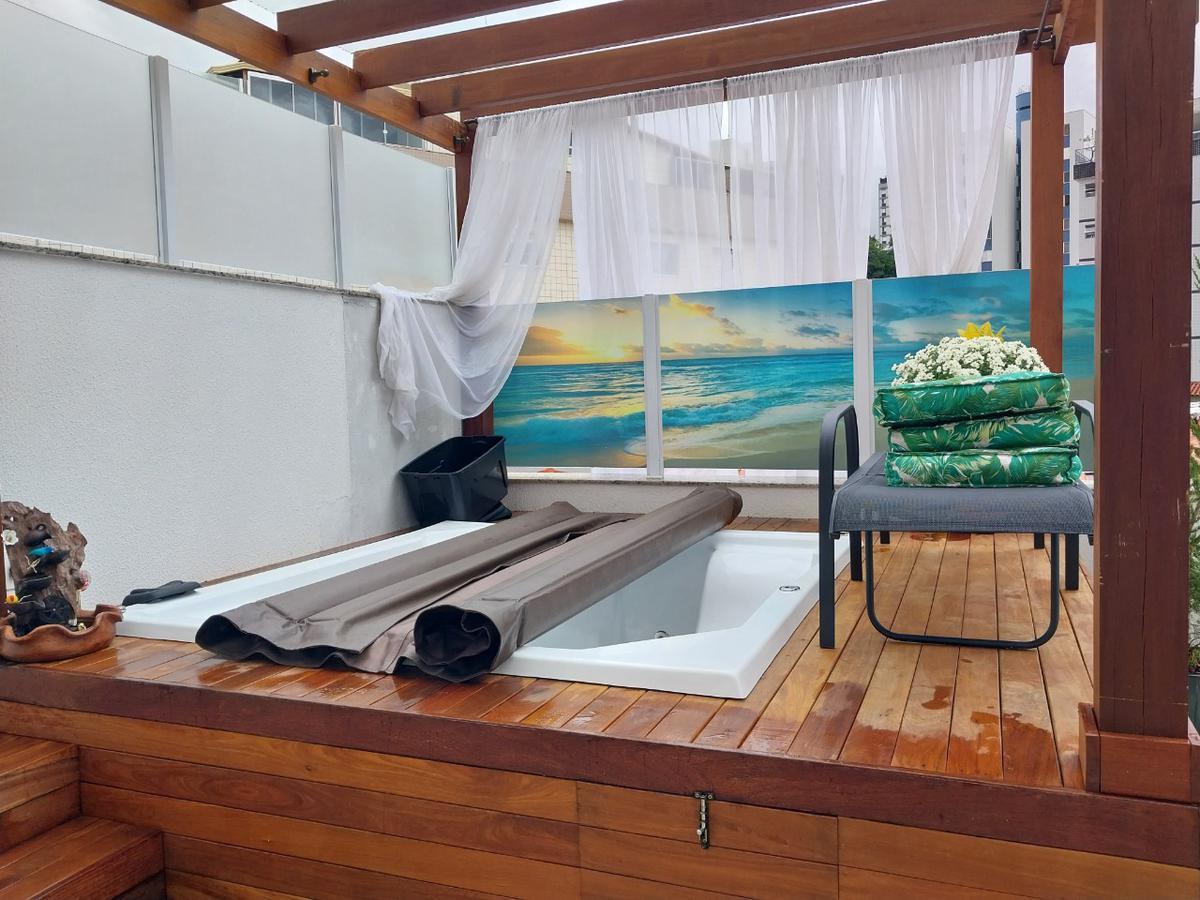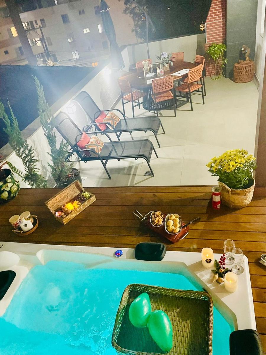 Área externa parte com cobertura em vidro, área gourmet, banheira com hidromassagem com aquecimento em deck de madeira, restante da área,descoberta; (vista panorâmica em toda área externa, condomínio com agua e gás individualizados.