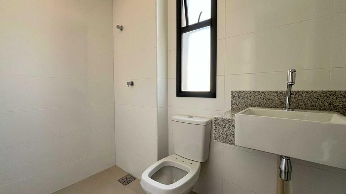Banheiros (social e suíte) com acabamento premium em porcelanato e bancadas em granito.