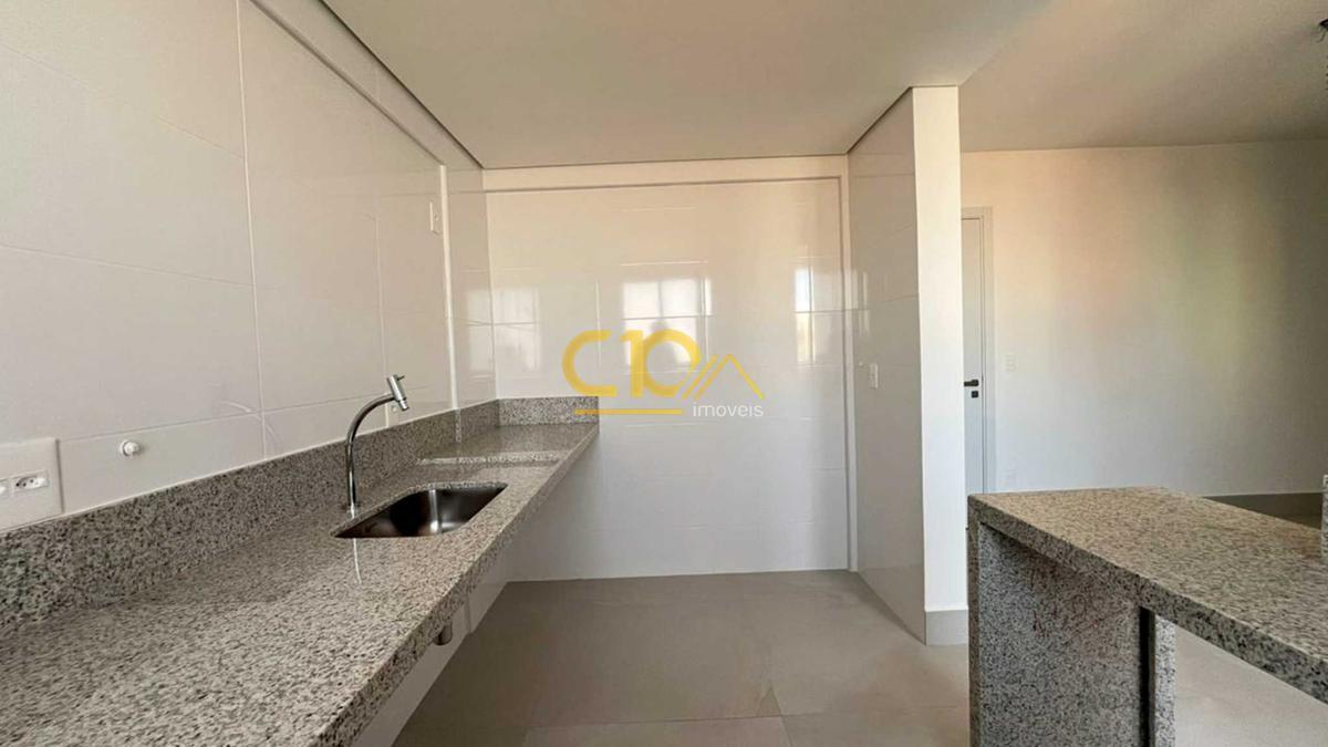 Cozinha americana com bancada em granito, totalmente integrada à sala.