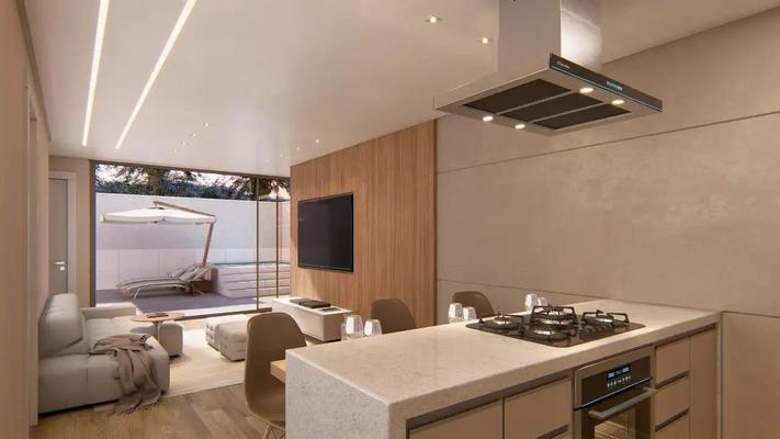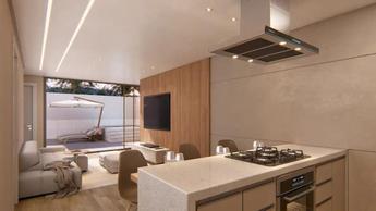 Apartamento com 63m² de área interna contando com dois quartos, sendo uma suíte, sala de estar, cozinha americana, área de serviço e ara gourmet, área externa com 35m² com piscina e spa, com duas vagas de garagem.