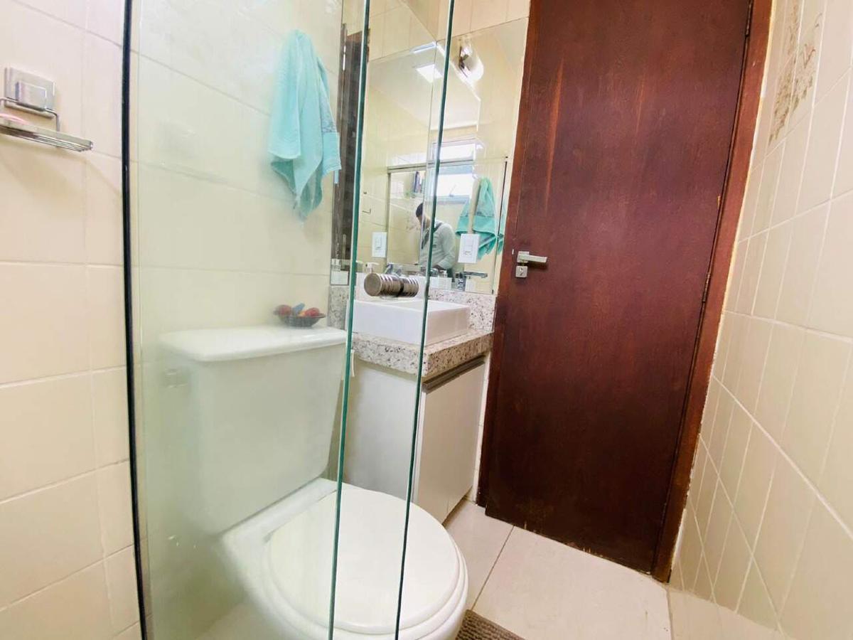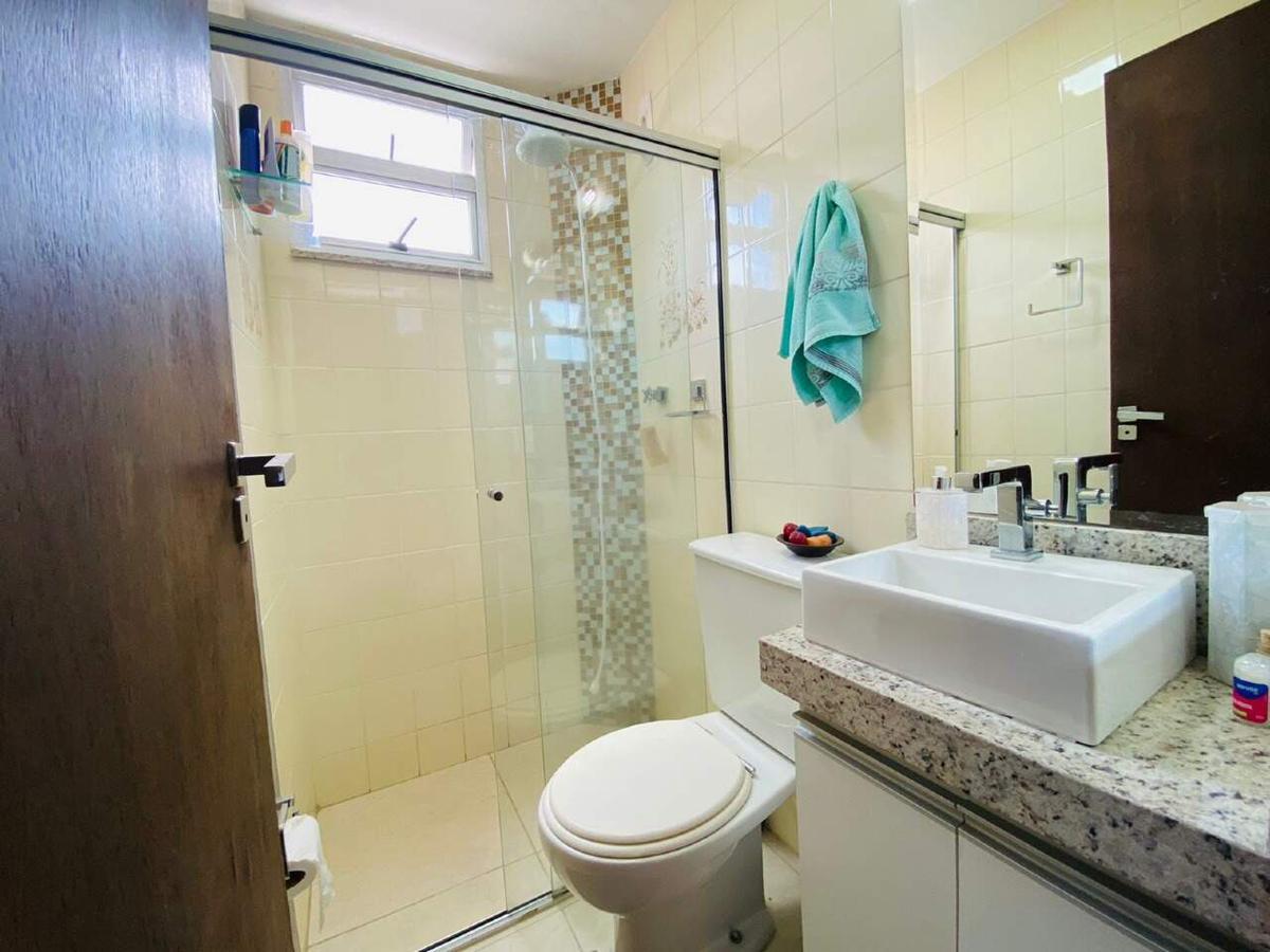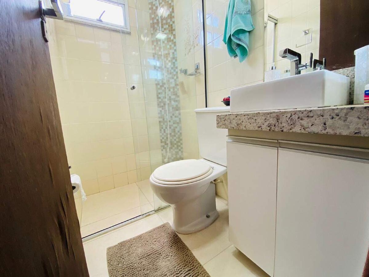 Banho social com armário, bancada em granito, box em blindex, espelho e piso em porcelanato.