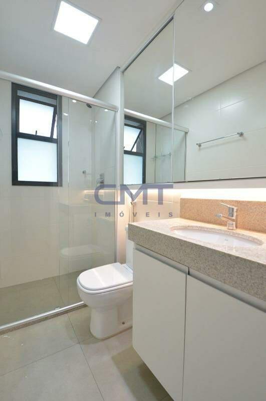 Banheiros com box em blindex, armários sob a bancada e acabamentos em granito.