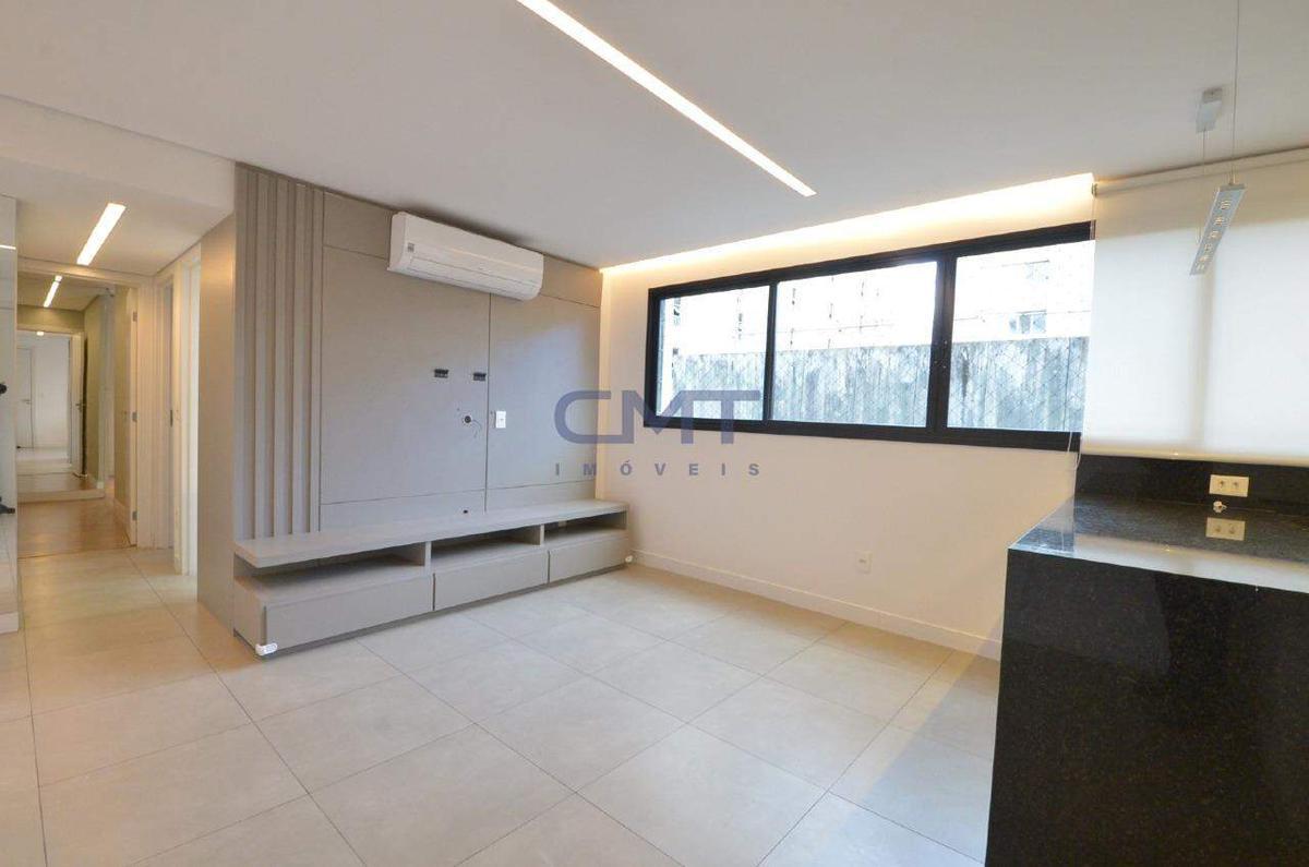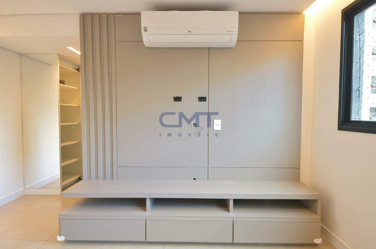 Sala para dois ambientes, com armários planejados, ar-condicionado, piso em porcelanato e janelas amplas, proporcionando ótima ventilação e luminosidade natural.