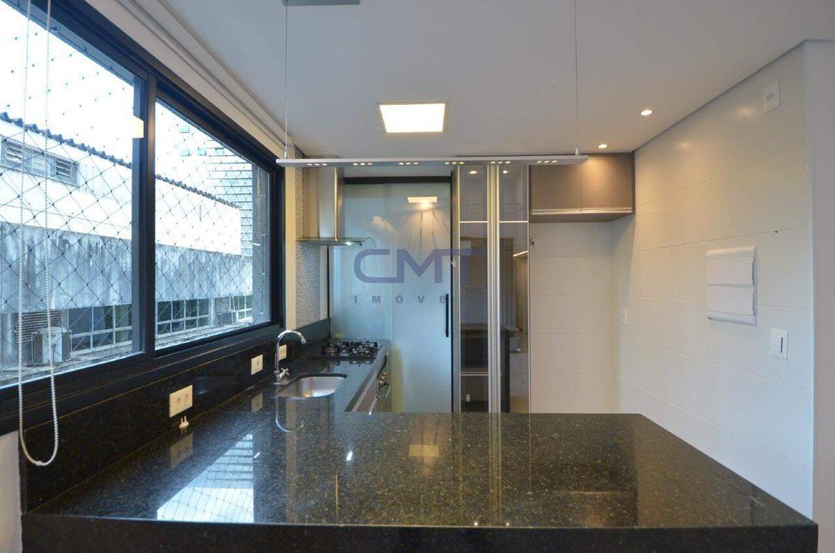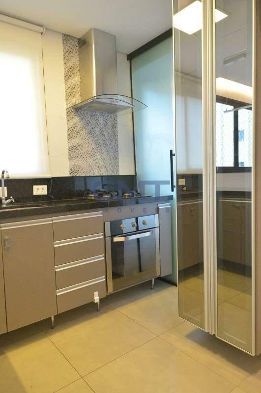 Cozinha com armários planejados, bem conservados, bancadas em granito e acesso independente à área de serviço.