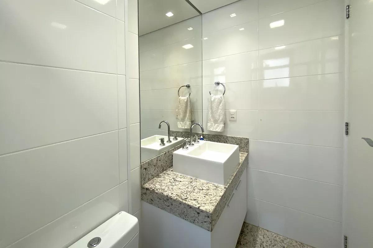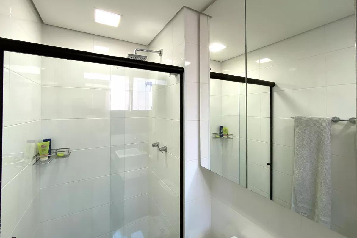 Banheiro social com espelho, bancada em granito, armários e box em blindex
