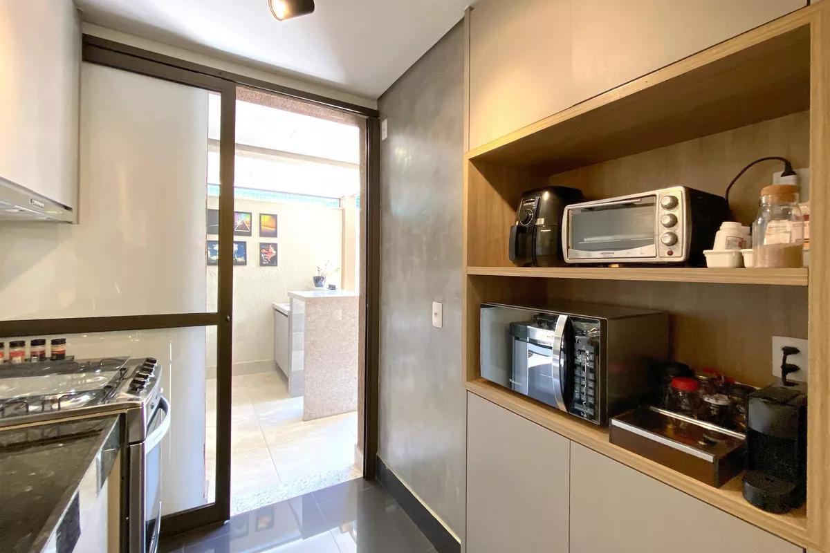 Cozinha com piso e bancada em granito, armários planejados e coifa, integrada à varanda gourmet