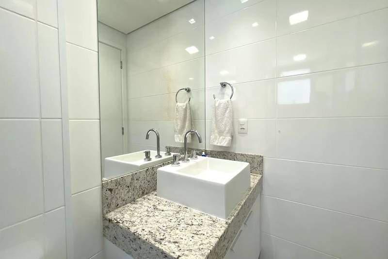 Banheiro social com espelho, bancada em granito, armários e box em blindex