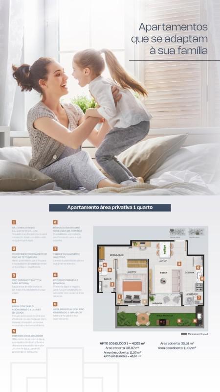 - Possibilidade de personalização futura das unidades, com integração da sala com a varanda.